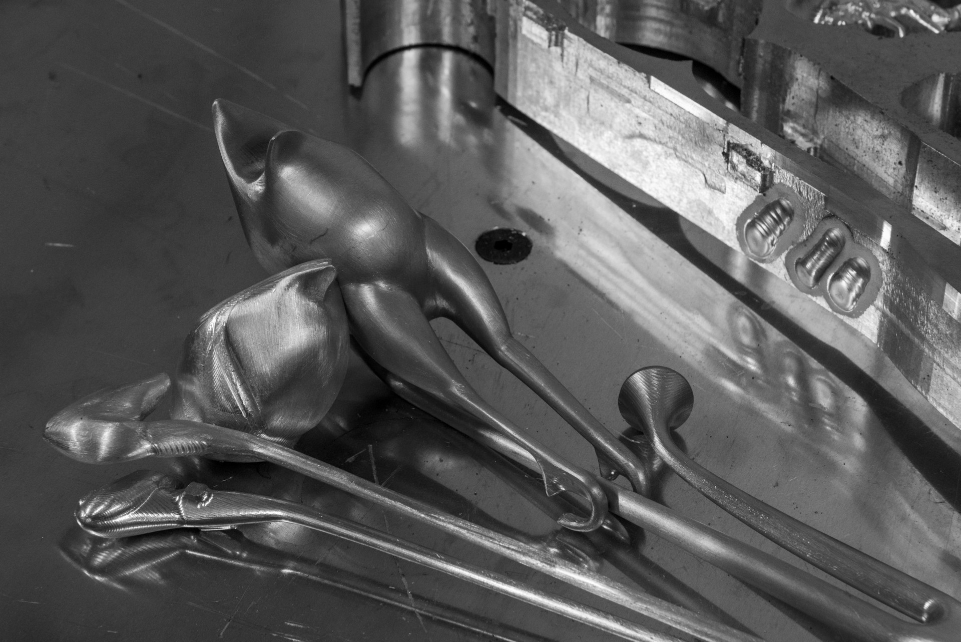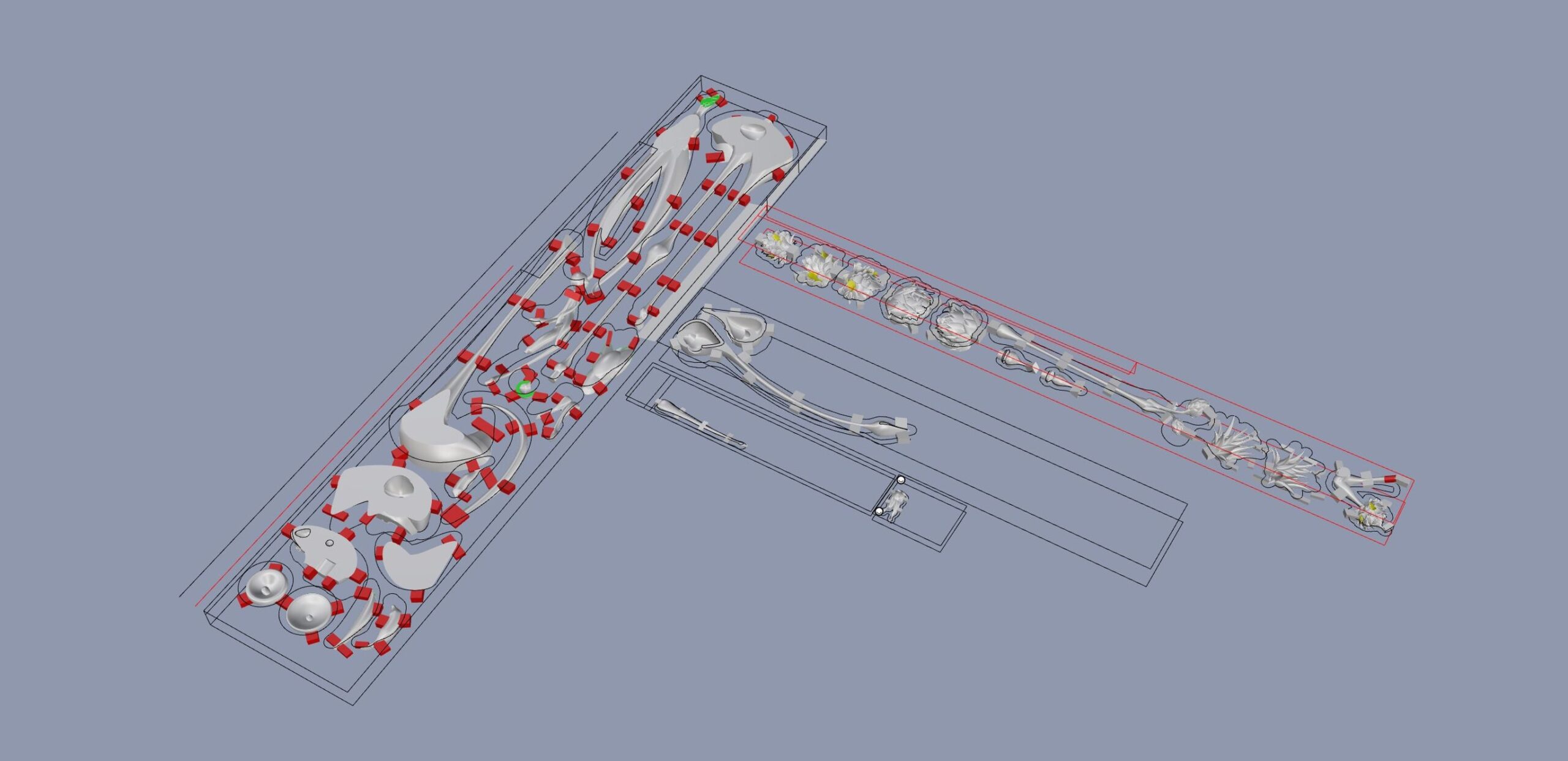 The elements are produced out of timber and metal, machined out of one piece and for multi-parts or bulky forms, the ‘organism’ is broken down into smaller parts and laid flat to process its inaccessible surfaces or hollow innards. Consequently, a pre-processed program – a computerised simulated pathway – is generated for the machine to morph the materials into an assembly kit.